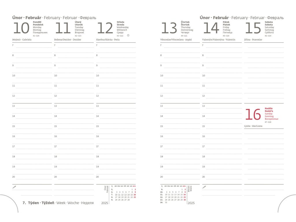 Obľubená matná koženka Vivella predstavuje kvalitný a na dotyk príjemný materiál, ktorý umožňuje dosiahnuť perfektné výsledky pri razbe bez fólie. Keďže je koženka priamo nakašírovaná na lepenku, sú dosky diára netradične tenké, vďaka čomu je diár Flexies ľahký a ohybný. Diár je doplnený praktickou gumičkou na uzatvorenie a pútkom na ceruzku.Diár obsahuje: osobné údaje, plánovač dovolenky (mesačný prehľad), plánovací kalendár, telefónne predvoľby, štátne sviatky Českej a Slovenskej republiky, medzinárodné sviatky, ročný výhľad, týždenný layout, adresár, mapa Európy a Českej a Slovenskej republiky.