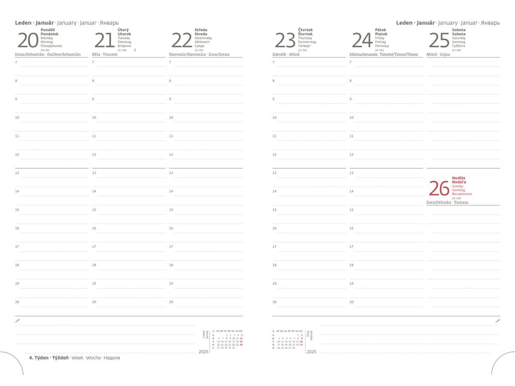 Matná koženka Vivella predstavuje kvalitný, na dotyk príjemný a zároveň veľmi obľubený materiál. Hrúbka materiálu umožňuje dosiahnuť perfektné výsledky pri razbe bez fólie.Diár obsahuje: osobné údaje, plánovač dovolenky (mesačný prehľad), plánovací kalendár, telefónne predvoľby, štátne sviatky Českej a Slovenskej republiky, medzinárodné sviatky, ročný výhľad, týždenný layout, adresár, mapa Európy a Českej a Slovenskej republiky.
