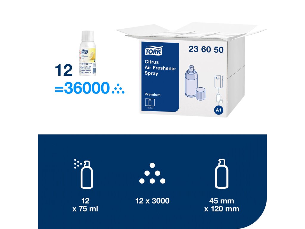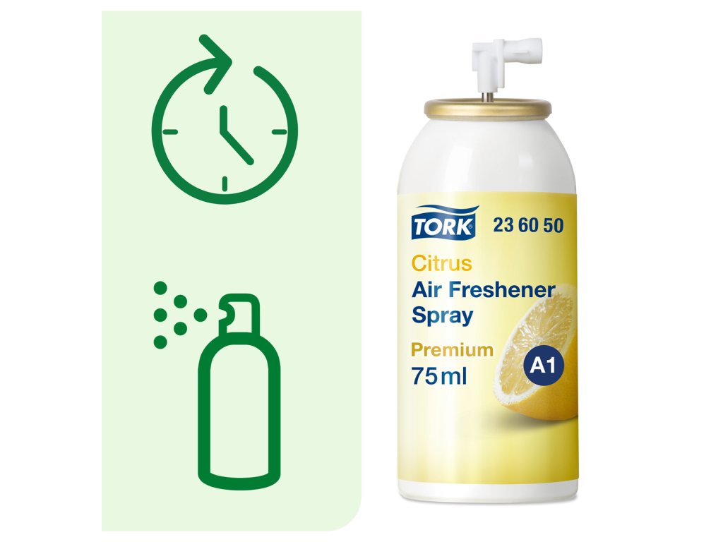 Náplň do elektronického osviežovača vzduchu TORK. Vôňu vo vašej toalete a umyvárni môžete dôkladne a efektívne kontrolovať. Sprej obsahuje vonné oleje a patentovanú zložku neutralizujúcu nepríjemné zápachy a zároveň poskytuje dlhotrvajúci pocit čerstvého vzduchu. Správna vôňa vyvinutá popredným európskym parfumérom.Objem 75 mℓ. Vôňa citrusová.