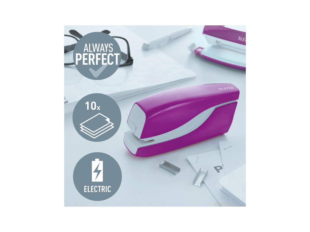 Elektrická zošívačka Leitz New NeXXt WOW. Vďaka jednoduchému ovládaniu jednou rukou je ideálna na časté používanie.Technológia s napájaním na batérie na zošívanie v pohybe. V žiarivých farbách WOW. Batérie (4× 1,5 V AAA LR03) nie sú súčasťou balenia. Kapacita 10 listov. Náhradné spinky ES556800. Farba purpurová.