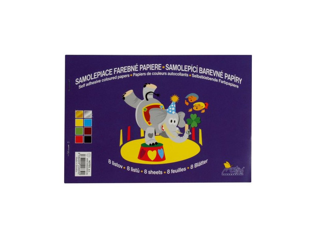 Farebné papiere samolepiace dodávané v sade 8 hárkov papiera rôznych farieb (zlatá, žltá, ružová, červená, zelená, modrá, hnedá, čierna) formátu 240 x 170 mm.Dodatočné parametre