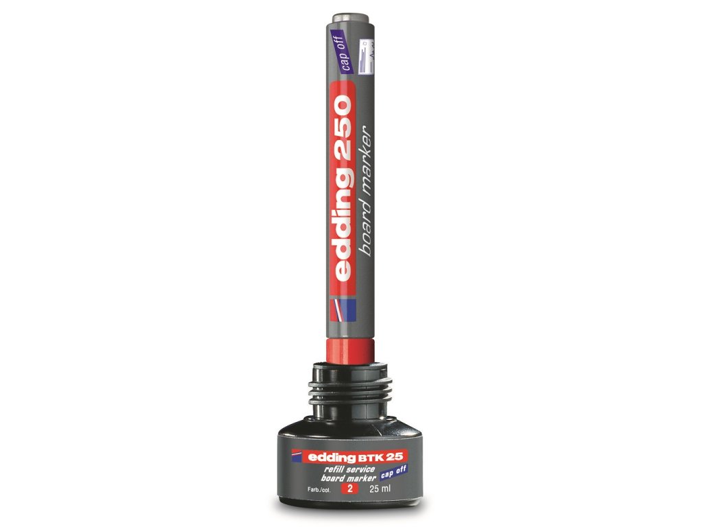 Popisovač na biele tabule, zasucha stierateľný. Plnený pigmentovým atramentom slabého zápachu bez prísady butylacetátu s vlastnosťou `Cap off`, zabraňujúcou vysychaniu atramentu pri otvorenom hrote aj niekoľko dní. Dopĺňateľný atramentom edding BT 30 alebo BTK 25. Hliníkové telo, vymeniteľný hrot. Hrot okrúhly, šírka stopy 1,5 - 3 mm. Dodávaný v sade 4 ks.Farba: mix 4 farieb