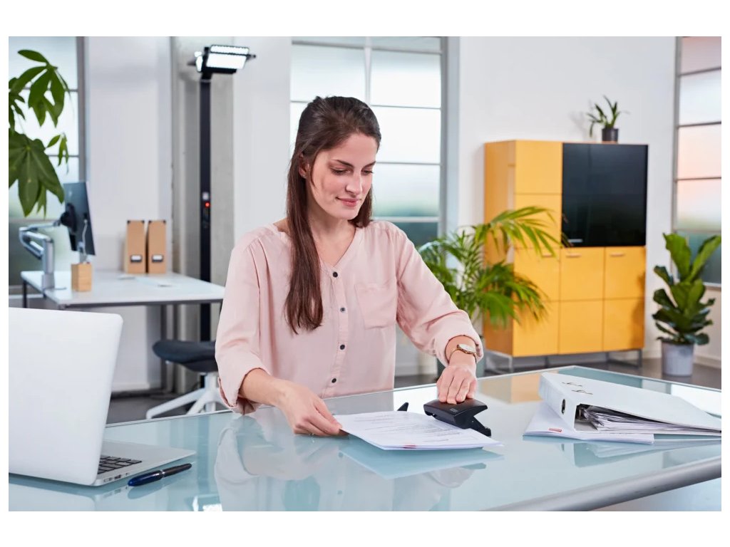 Celokovová kancelárska dierovačka s posuvným pravítkom a plastovým poťahom v dizajne zošívačky Novus C2. Rozpätie dier 8 cm. Hmotnosť 190 g. Záruka 5 rokov.Farba: čierna