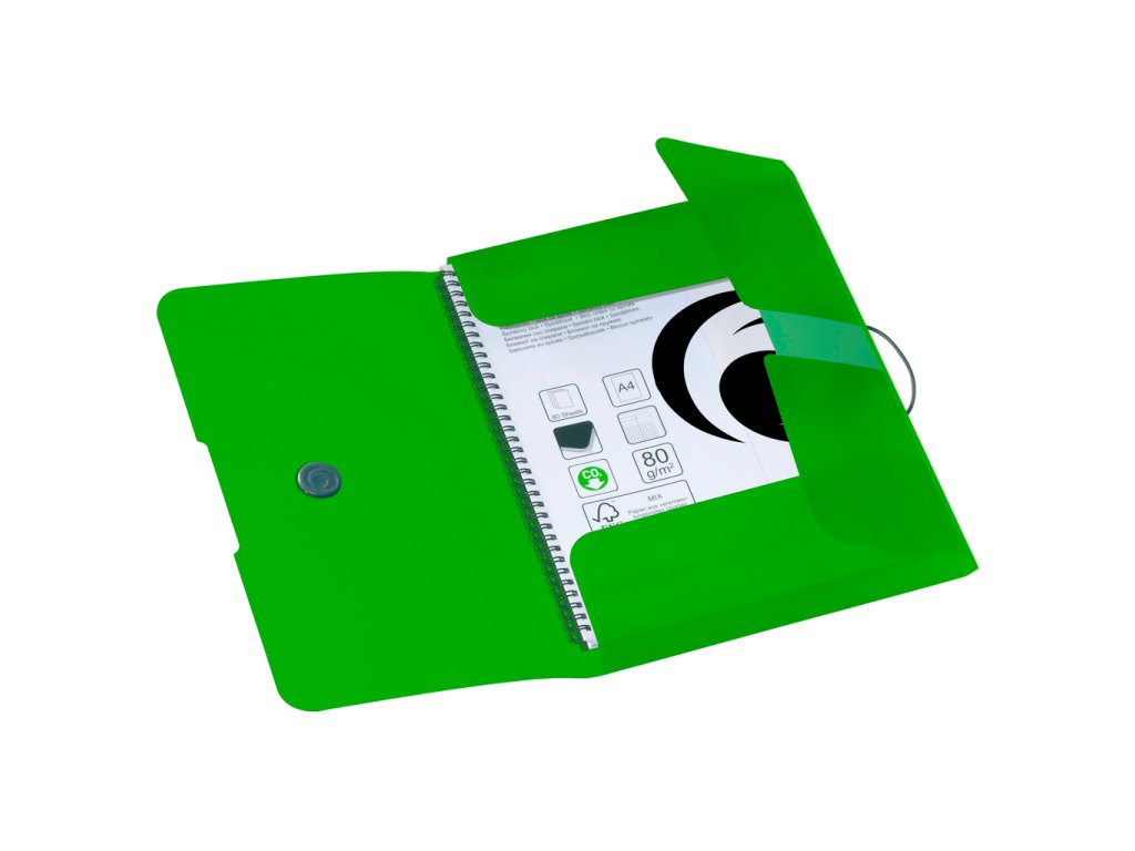 Obal s tromi chlopňami radu Easy Orga z polypropylénu na dokumenty formátu A4. Kapacita 300 listov. Zatváranie sivou gumičkou o sivý plastový krúžok. Väčšie balenie 3 ks. Farba zelená.Dodatočné parametre