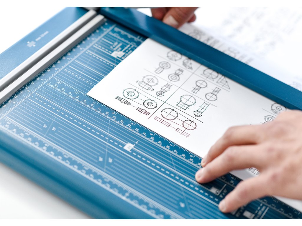 Páková rezačka z pevného oceľového plechu. Základný vrchný a základný spodný brúsený nôž vyrobený z kvalitnej nožiarskej ocele Solingen. Rotujúci kryt okolo ostria chráni prsty pred náhodným porezaním. Presná mierka v cm/inch a DIN formátoch. Automatický prítlak. Model s výrezmi na pohodlné prenášanie.Dĺžka rezu: 360 mm