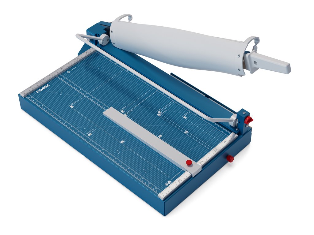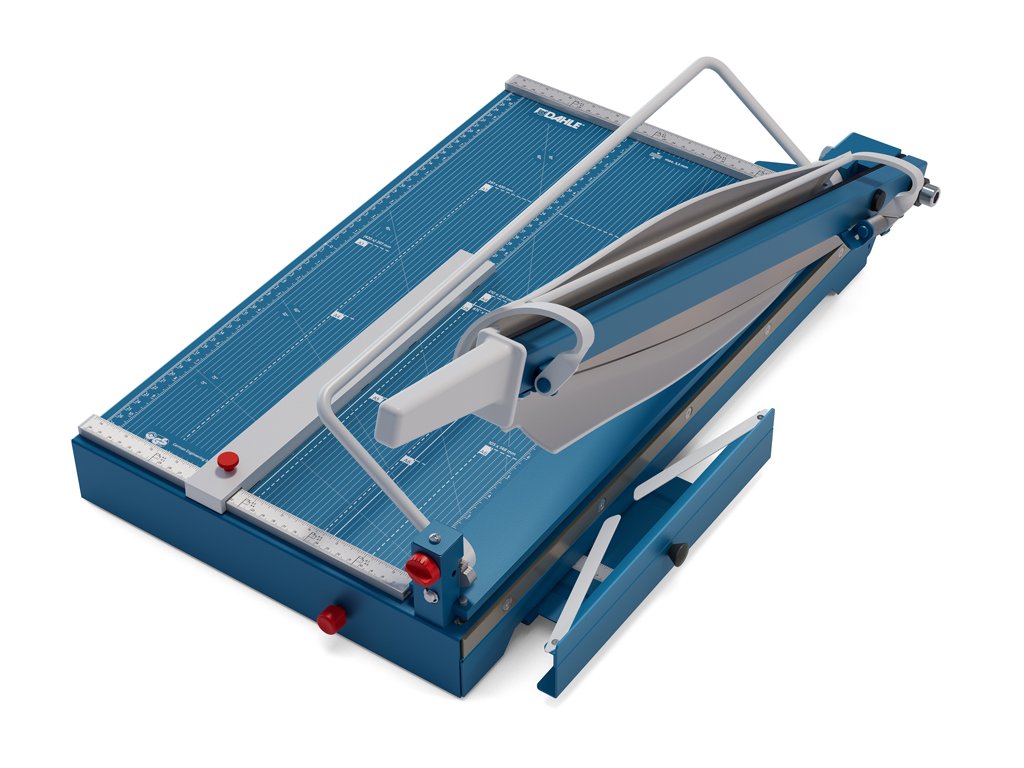 Páková rezačka z pevného oceľového plechu na rezanie papiera, kartónu, kože, plastu. Brúsený vrchný a spodný nôž z kvalitnej nožiarskej ocele Solingen, automatický ochranný kryt, rotujúci okolo ostria, predný doraz roztiahnuteľný do 210 mm, prítlak pomocou prítlačnej páky, 2 bočné dorazy. Presná mierka v cm/inch a DIN formátoch. Veľkosť stola 600 × 365 mm.Dĺžka rezu: 550 mm