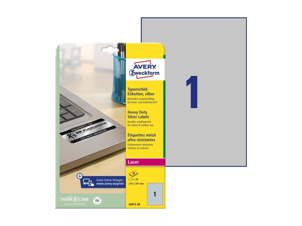 Veľmi odolné polyesterové etikety odolné voči oleju, prachu, špine, natrhnutiu, vode. Odolávajú teplotám od −40 ° do + 150 °C. Určené pre tlač v laserových tlačiarňach. Vhodné aj pre vonkajšie použitie. Rozmery v mm : 210 × 297. Farba strieborná. Etikety na hárku 1 kus. Balenie 20 hárkov.Dodatočné parametre