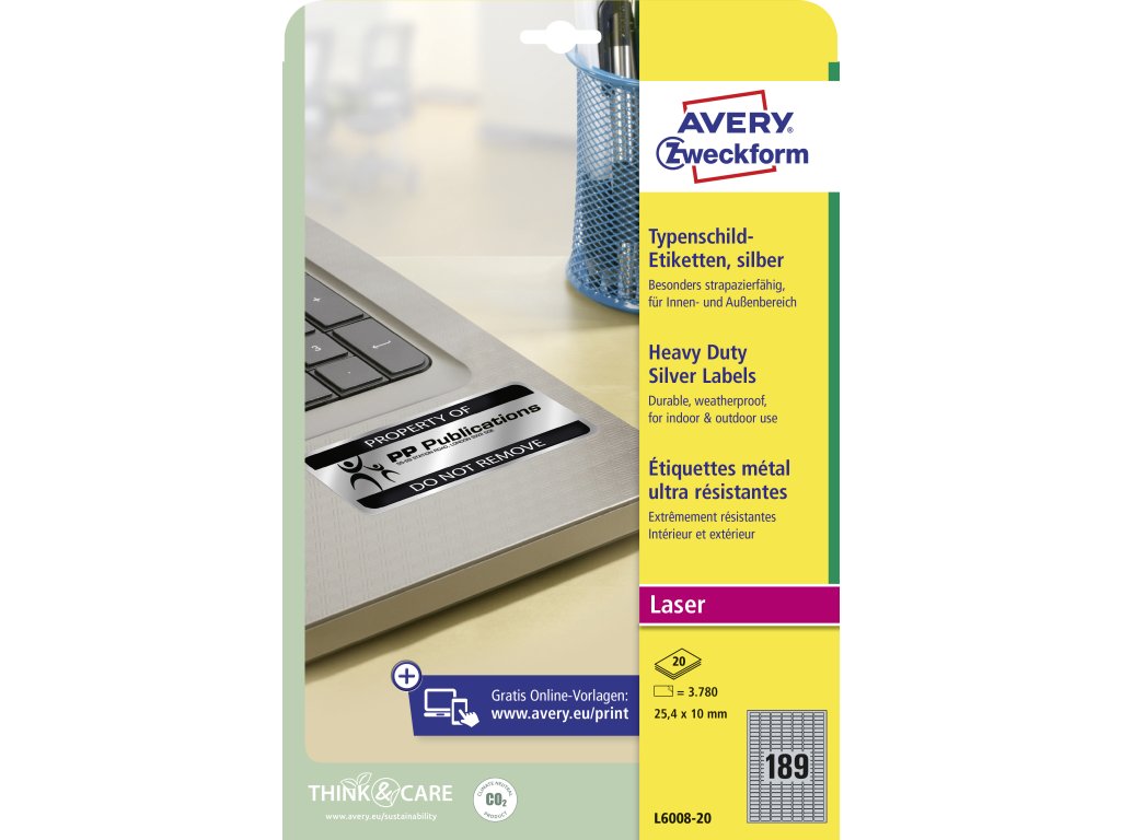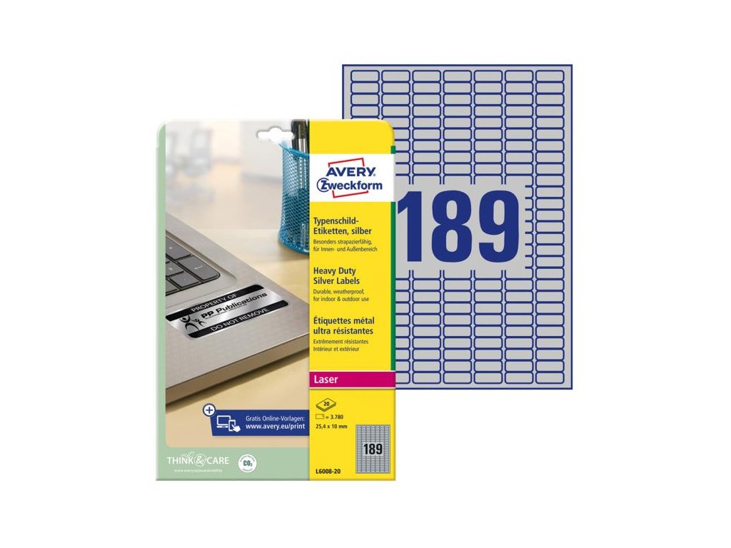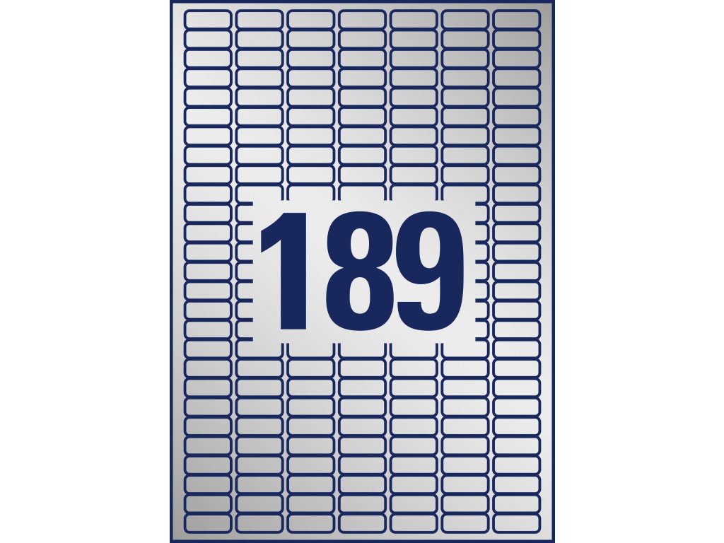 Veľmi odolné polyesterové etikety odolné voči oleju, prachu, špine, natrhnutiu, vode. Odolávajú teplotám od −40 ° do + 150 °C. Určené pre tlač v laserových tlačiarňach. Vhodné aj pre vonkajšie použitie. Rozmery v mm : 25,4 × 10. Farba strieborná. Etikety na hárku 189 kusov. Balenie 20 hárkov.Dodatočné parametre