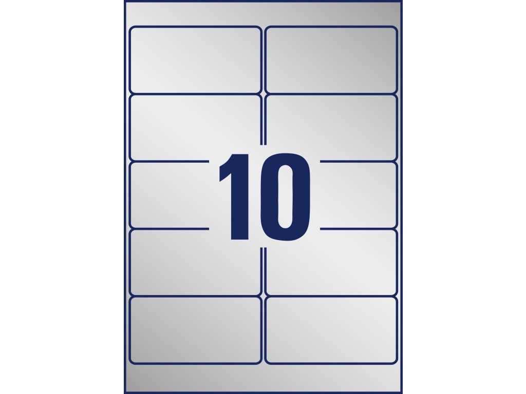 Veľmi odolné polyesterové etikety odolné voči oleju, prachu, špine, natrhnutiu, vode. Odolávajú teplotám od −40 ° do + 150 °C. Určené pre tlač v laserových tlačiarňach. Vhodné aj pre vonkajšie použitie. Rozmery v mm : 96 × 50,8. Farba strieborná. Etikety na hárku 10 kusov. Balenie 20 hárkov.Dodatočné parametre