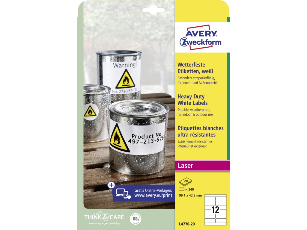 Veľmi odolné polyesterové etikety odolné voči oleju, prachu, špine, natrhnutiu, vode. Odolné voči teplotám od -20° do +80°C. Sú určené pre tlač v laserových, farebných laserových tlačiarňach a kopírkach a sú vhodné aj pre vonkajšie použitie.Rozmery v mm : 99,1 × 42,3. Farba biela. Etikety na hárku 12 kusov. Balenie 20 hárkov.