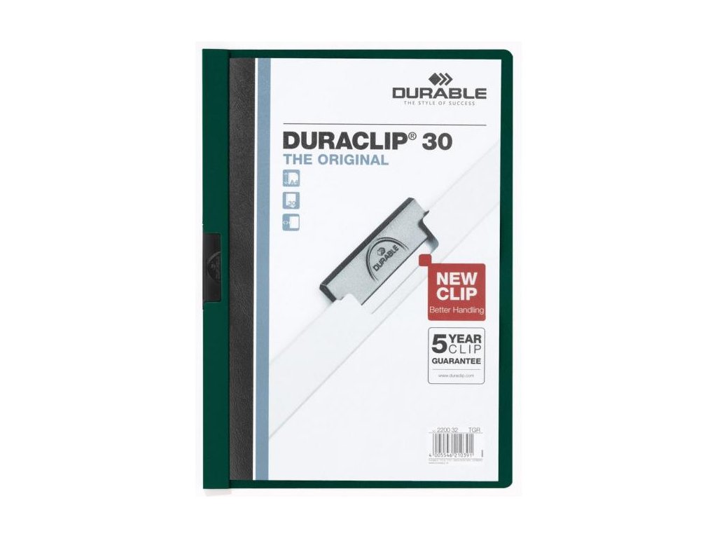 Obal vyvinutý spoločnosťou DURABLE pre viazanie nedierovaných listov. Materiál z PVC s unikátnym kovovým klipom, ktorý sa prispôsobí vloženému počtu listov a priehľadnou prednou stranou. Ideálny na prezentácie, ponuky, správy, poznámky na konferencie, semináre a pod. Formát A4. Kapacita 1-30 listov. Väčšie balenie 25 ks.Kapacita: 1-30 listov