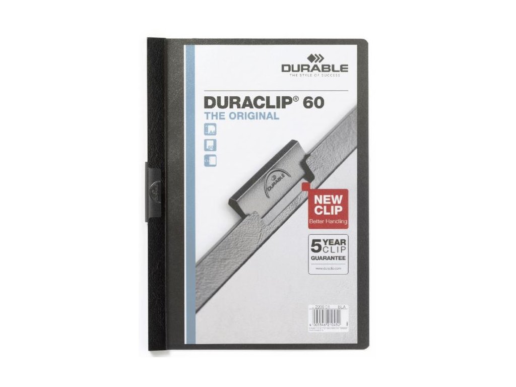 Obal vyvinutý spoločnosťou DURABLE pre viazanie nedierovaných listov. Materiál z PVC s unikátnym kovovým klipom, ktorý sa prispôsobí vloženému počtu listov a priehľadnou prednou stranou. Ideálny na prezentácie, ponuky, správy, poznámky na konferencie, semináre a pod. Formát A4. Kapacita 1-60 listov. Väčšie balenie 25 ks.Kapacita: 1-60 listov