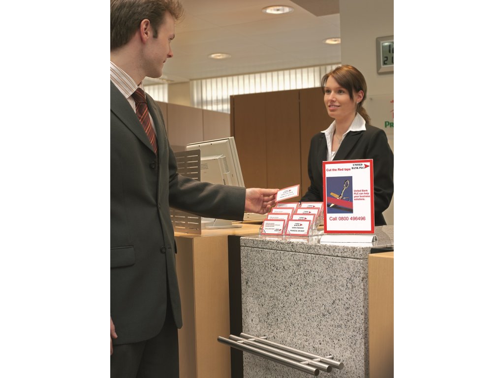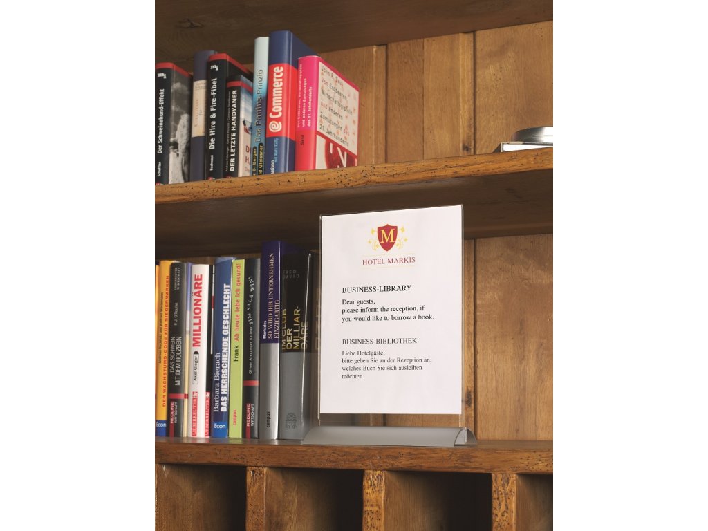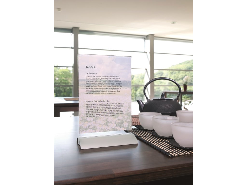 Stojan vhodný na prezentáciu ľubovoľných informácií s dobrou stabilitou. Vrchná časť vyrobená z kvalitného číreho akrylu, elegantný podstavec z hlíníka.Rozmery: 150x237x85 mm
