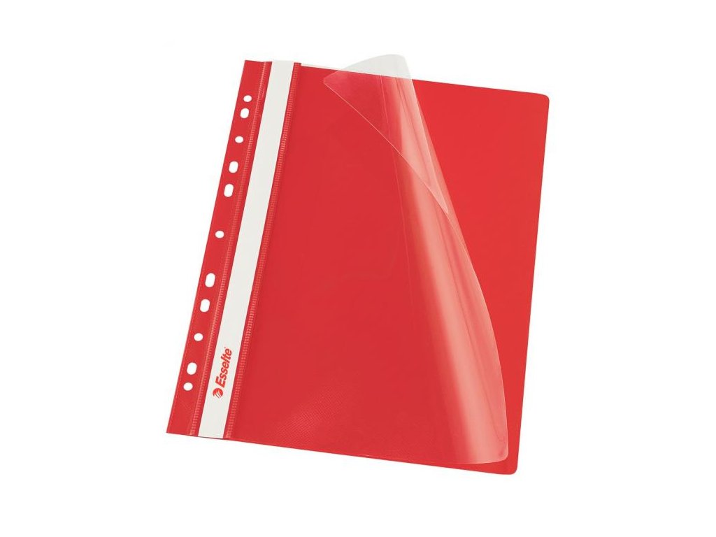 Obal s eurodierovaním z kvalitného PVC na uloženie dierovaných dokumentov do formátu A4. Predná strana priehľadná, pozdĺž chrbta biely obojstranný papierový zasúvací štítok. Rozmery 310 × 235 mm. Farba červená.Dodatočné parametre