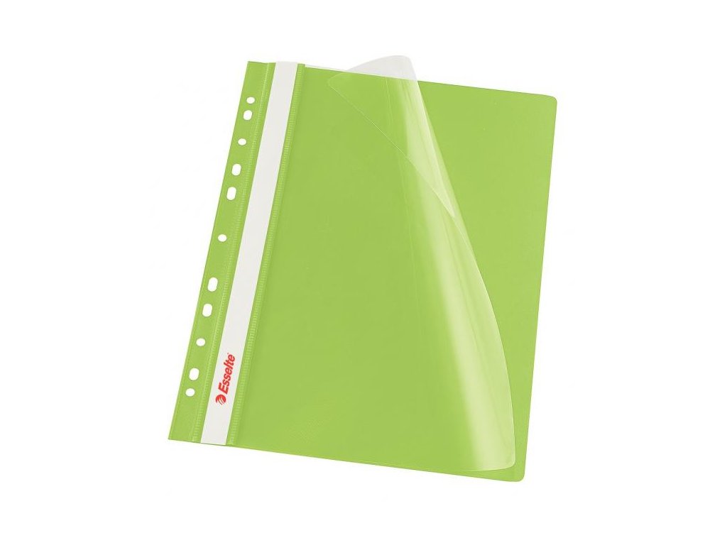 Obal s eurodierovaním z kvalitného PVC na uloženie dierovaných dokumentov do formátu A4. Predná strana priehľadná, pozdĺž chrbta biely obojstranný papierový zasúvací štítok. Rozmery 310 × 235 mm. Farba zelená.Dodatočné parametre
