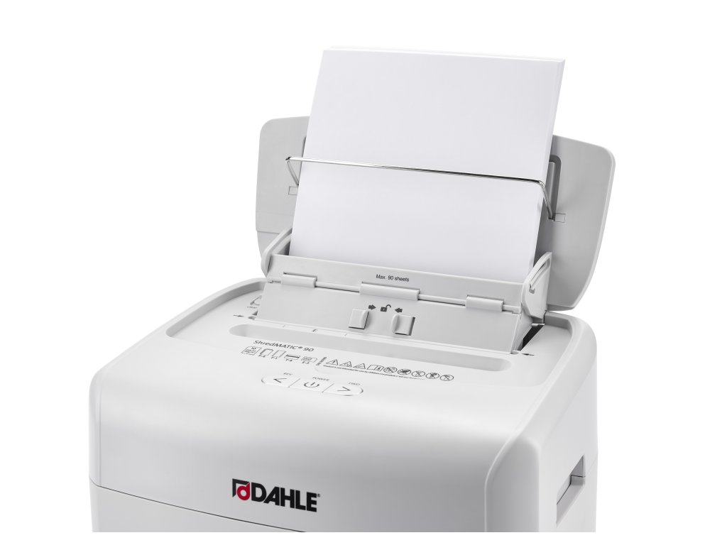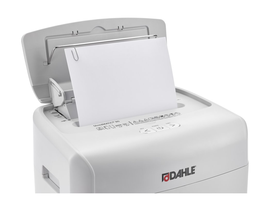 Výkonná inteligentná skartovačka k písaciemu stolu s automatickým podávačom papieru a jemným rezaním na častice P-4.Bezúdržbová prevádzka bez použitia oleja. Extra malé častice pre menej časté vyprázdňovanie. Integrovaný senzor pre automatickú funkciu Start/Stop k zaisteniu rýchlej dostupnosti a na bezpečné používanie. Automatický spätný chod znova uvoľní príliš veľké množstvo vloženého papiera. Komfortné funkcie manuálneho obojsmerného chodu. Automatické bezpečnostné vypnutie pri naplnenej odpadovej nádobe alebo pri otvorení dvierok. Optický ukazovateľ úrovne naplnenia. Funkcia automatického podávania skartuje až 90 listov (80 g/m²) v jednej dávke, optická indikácia preťaženia. Samozrejmosťou je ručné vkladanie až 10 listov. Ochrana pred prehriatím s optickým indikátorom. Vyberateľná zberná nádoba. Komfortné pohyblivé kolieska pre väčšiu mobilitu. Dve revízne klapky pre jednoduché čistenie automatického vkladania papiera.