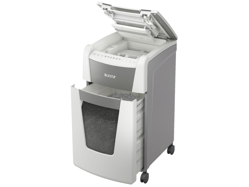 Plnoautomatická skartovačka na papier od firmy Leitz s jedinečnou čistou vyprázdňovacou funkciou. Je taká inteligentná, že potichu pracuje sama, len vložíte stoh papiera (vrátane kancelárskych sponiek a sponiek do zošívačky), zatvoríte veko a môžete ísť za svojou robotou. Ideálna na používanie v kanceláriách. Dôveryhodná a vysokovýkonná skartovačka s automatickým podávaním, s funkciou proti zaseknutiu papiera, tichá a s dlhou dobou prevádzky (60 minút). Automaticky skartuje 300 hárkov A4 na úrovni zabezpečenia P-4 (4 × 28 mm) s krížovým rezom do veľkého 60l koša. Jednoduché ovládanie pomocou dotykových prvkov.