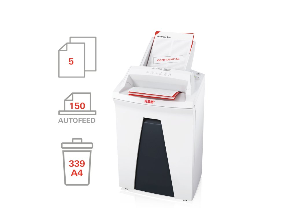 Skartovačka strednej triedy s automatickým podávačom dokumentov. Kapacita podávača s otvoreným prevedením je 150 listov. V priebehu skartovania z podávača je možné pridávať papier do skartovacej štrbiny do maximálnej reznej kapacity. Stroj je vybavený systémom úspory elektrickej energie. Masívne nože v krížovom reze majú zvýšený stupeň utajenia (utajenie typ P-4). Napriek tomu umožňujú spracovanie papiera s kancelárskymi sponkami, plastových kariet aj CD. Do odpadovej nádoby možno umiestniť plastové vrece (nie je nutné). Záruka na stroj 36 mesiacov, doživotná záruka na nože. Rez 0,78x11 mm.Dodatočné parametre