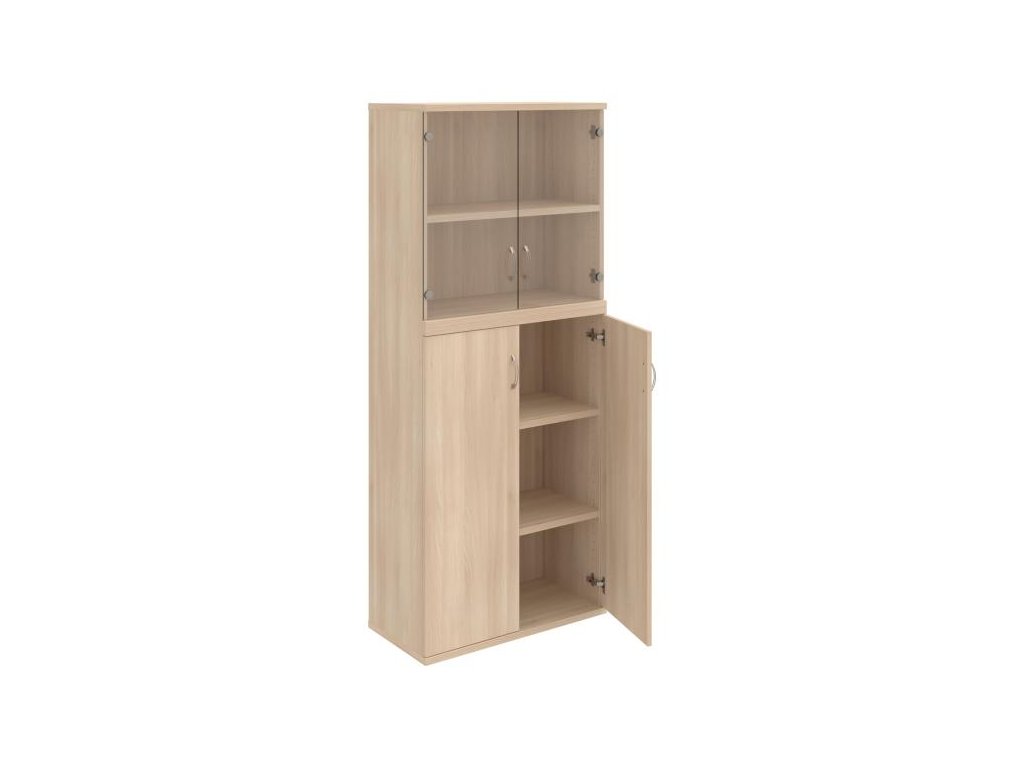 Kombinovaná skriňa - dvere/nika. Kancelárske skrine STRONG majú robustnú konštrukciu a vyššiu nosnosť políc ako bežné kancelárske skrine.V ponuke sú skriňové moduly s výškou 185 cm, 111 cm alebo 74 cm a šírky 80 cm alebo 40 cm. Hĺbka všetkých modelov skriňového radu STRONG je 40 cm.Chrbát, vyrobený z 8 mm hrubých dosák, je obojstranne pohľadový, takže skrine môžete použiť ako priestorový deliaci prvok. Hrúbka samotných políc je 25 mm, čo znamená nosnosť 80 kg na 1 policu.Korpusy, dvierka a police skríň sú olepené odolnou 2mm ABS hranou, ktorá garantuje dostatočnú ochranu proti poškodeniu.