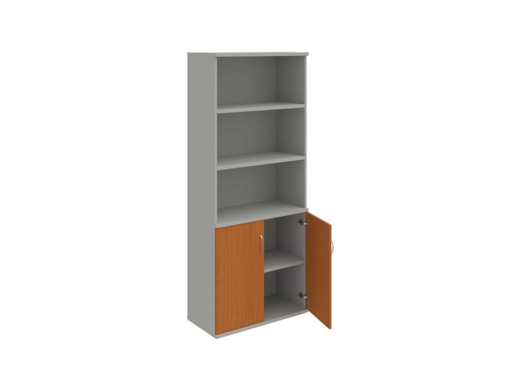 Kombinovaná skriňa - dvere/nika. Kancelárske skrine STRONG majú robustnú konštrukciu a vyššiu nosnosť políc ako bežné kancelárske skrine.V ponuke sú skriňové moduly s výškou 185 cm, 111 cm alebo 74 cm a šírky 80 cm alebo 40 cm.Hĺbka všetkých modelov skriňového radu STRONG je 40 cm.Chrbát, vyrobený z 8 mm hrubých dosák, je obojstranne pohľadový, takže skrine môžete použiť ako priestorový deliaci prvok. Hrúbka samotných políc je 25 mm, čo znamená nosnosť 80 kg na 1 policu.Korpusy, dvierka a police skríň sú olepené odolnou 2mm ABS hranou, ktorá garantuje dostatočnú ochranu proti poškodeniu.