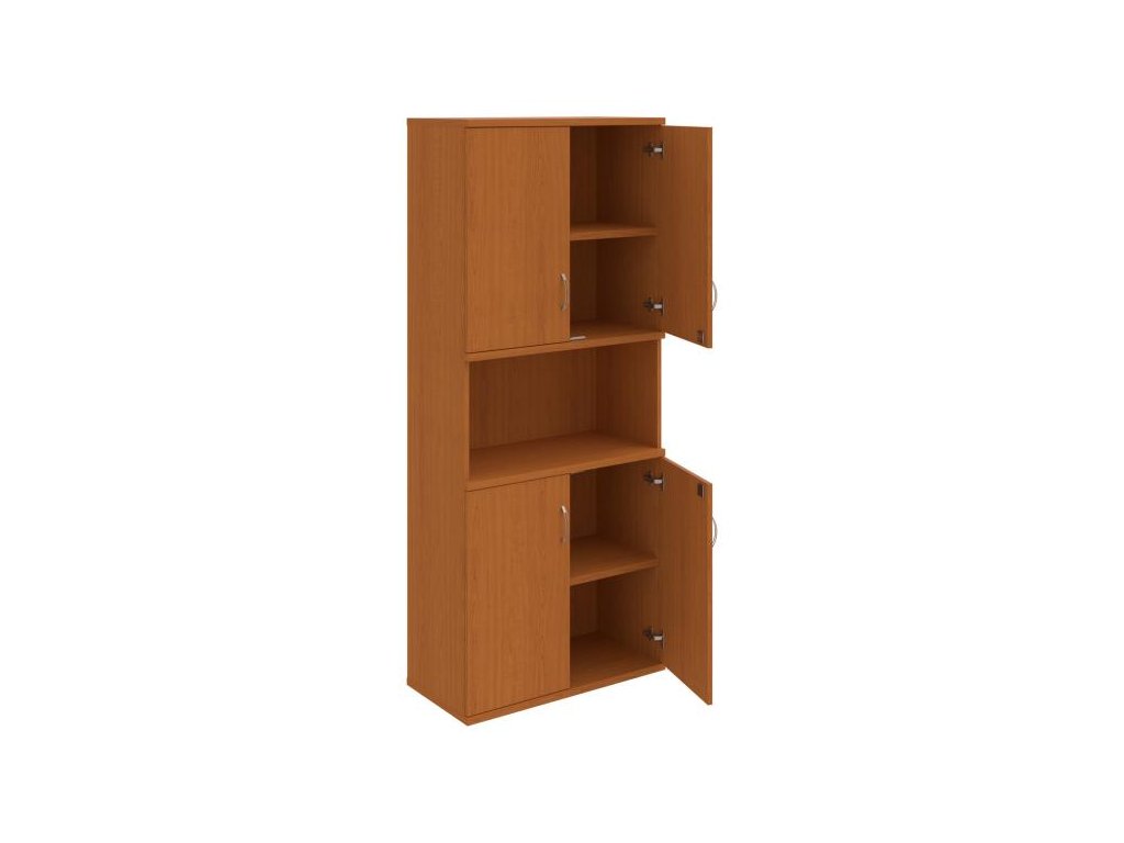 Kombinovaná skriňa - dvere/nika. Kancelárske skrine STRONG majú robustnú konštrukciu a vyššiu nosnosť políc ako bežné kancelárske skrine.V ponuke sú skriňové moduly s výškou 185 cm, 111 cm alebo 74 cm a šírky 80 cm alebo 40 cm.Hĺbka všetkých modelov skriňového radu STRONG je 40 cm.Chrbát, vyrobený z 8 mm hrubých dosák, je obojstranne pohľadový, takže skrine môžete použiť ako priestorový deliaci prvok. Hrúbka samotných políc je 25 mm, čo znamená nosnosť 80 kg na 1 policu.Korpusy, dvierka a police skríň sú olepené odolnou 2mm ABS hranou, ktorá garantuje dostatočnú ochranu proti poškodeniu.