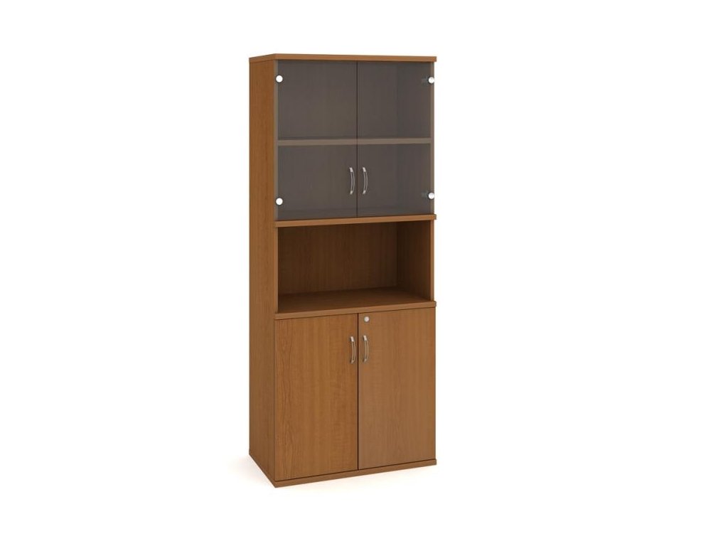 Kombinovaná skriňa - dvere/nika. Kancelárske skrine STRONG majú robustnú konštrukciu a vyššiu nosnosť políc ako bežné kancelárske skrine.V ponuke sú skriňové moduly s výškou 185 cm, 111 cm alebo 74 cm a šírky 80 cm alebo 40 cm. Hĺbka všetkých modelov skriňového radu STRONG je 40 cm.Chrbát, vyrobený z 8 mm hrubých dosák, je obojstranne pohľadový, takže skrine môžete použiť ako priestorový deliaci prvok. Hrúbka samotných políc je 25 mm, čo znamená nosnosť 80 kg na 1 policu.Korpusy, dvierka a police skríň sú olepené odolnou 2mm ABS hranou, ktorá garantuje dostatočnú ochranu proti poškodeniu.
