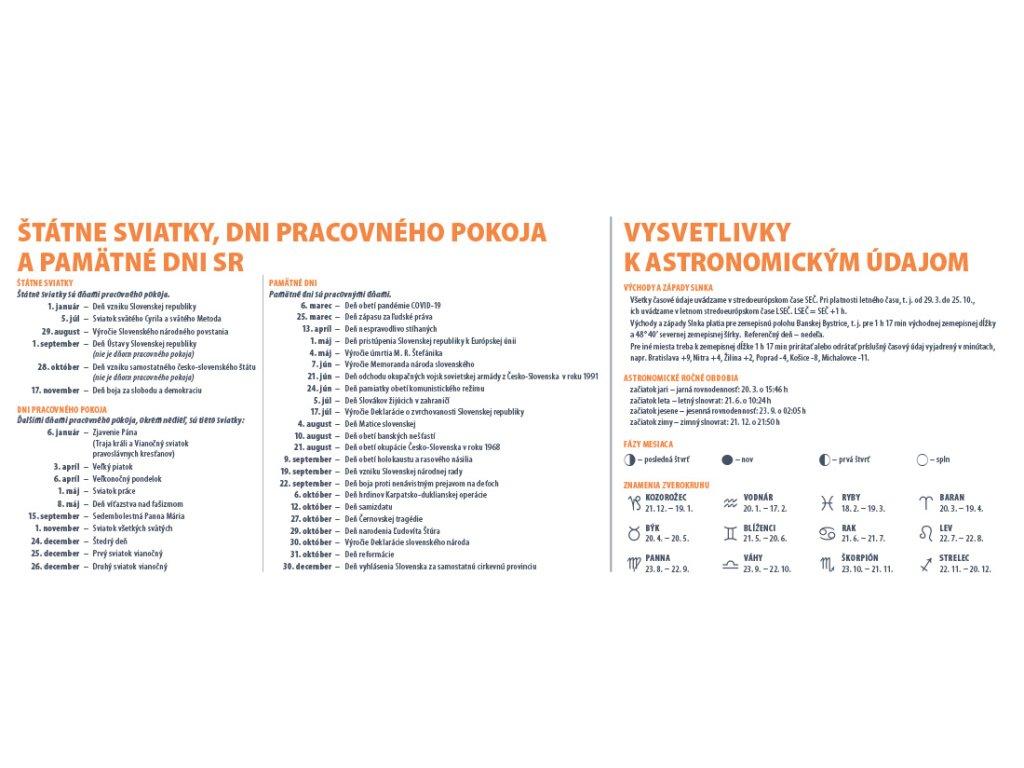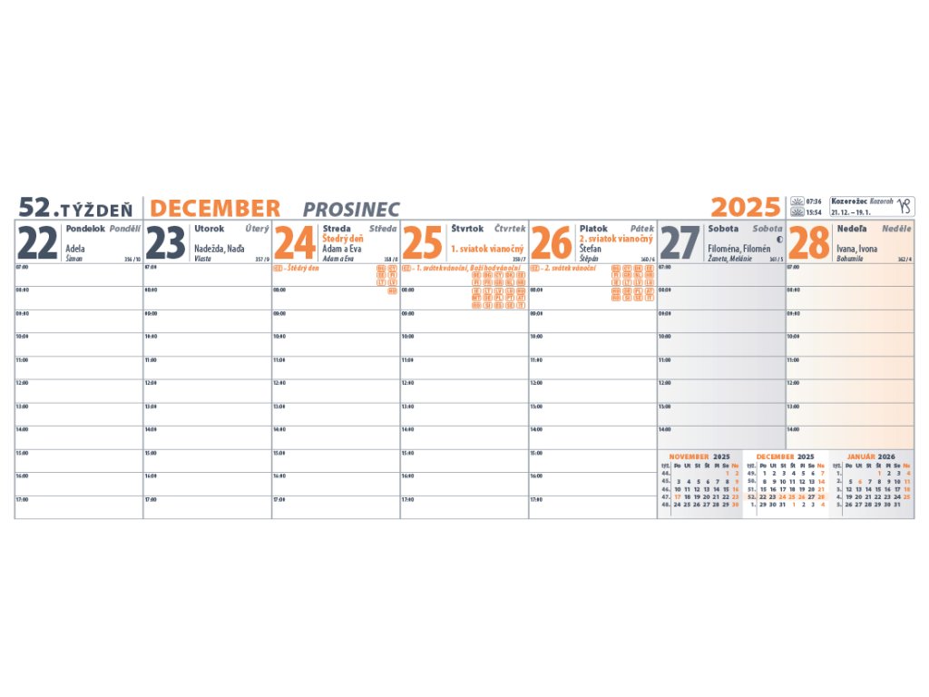 Najpredávanejší stolový kalendár, veľmi prehľadný, vhodný pre aktívnych ľudí. Obsahuje dostatočný priestor na poznámky a všetky potrebné informácie pre každý pracovný deň. Týždňový stĺpcový kalendár s hodinovým delením, daňovými pripomienkami, mesačnými kalendáriami, fázami Mesiaca, východmi, západmi Slnka, štátnymi sviatkami krajín EÚ, školskými prázdninami, znameniami zverokruhu, slovenskými a českými menami (plus netradičné mená).Formát: 300 × 120 mm