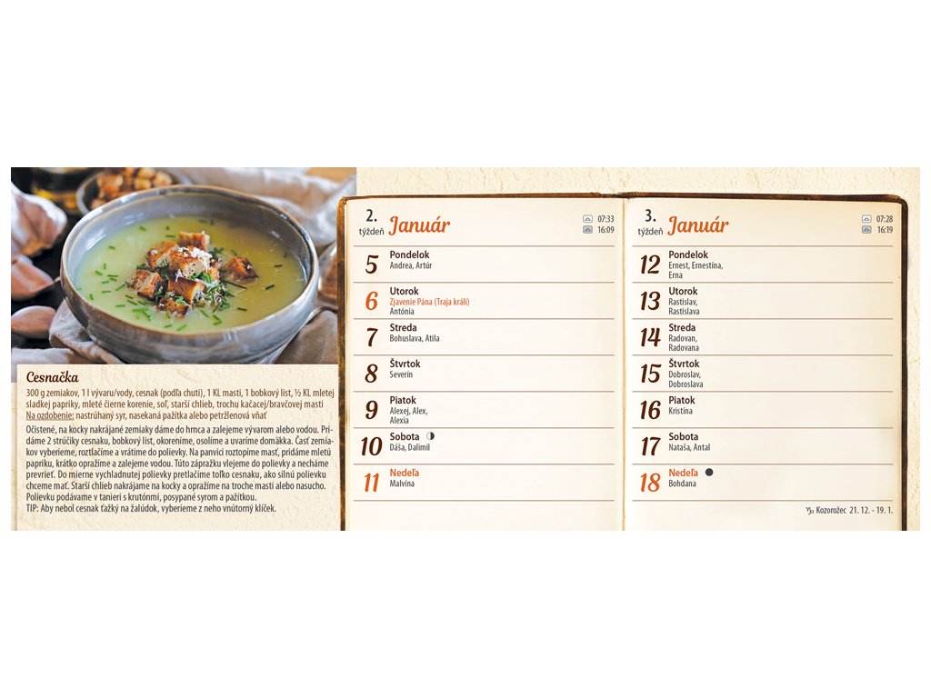 Kto varí a pečie najlepšie na svete? No predsa stará mama. Stolový dvojtýždňový kalendár prináša slané aj sladké recepty našich starých mám. Okrem receptov kalendár ponúka slovenské, štátne sviatky a pamätné dni, školské prázdniny, východy a západy Slnka, fázy Mesiaca a znamenia zverokruhu.Formát: 300 × 120 mm.