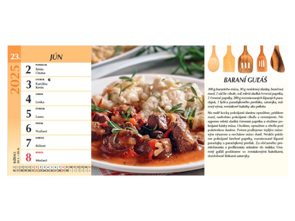 Stolový riadkový kalendár s chutnými inšpiráciami na varenie aj pečenie. Pestré zábery a prehľadné recepty Vám spríjemnia čas strávený v kuchyni.Formát: 297 x 138 mm
