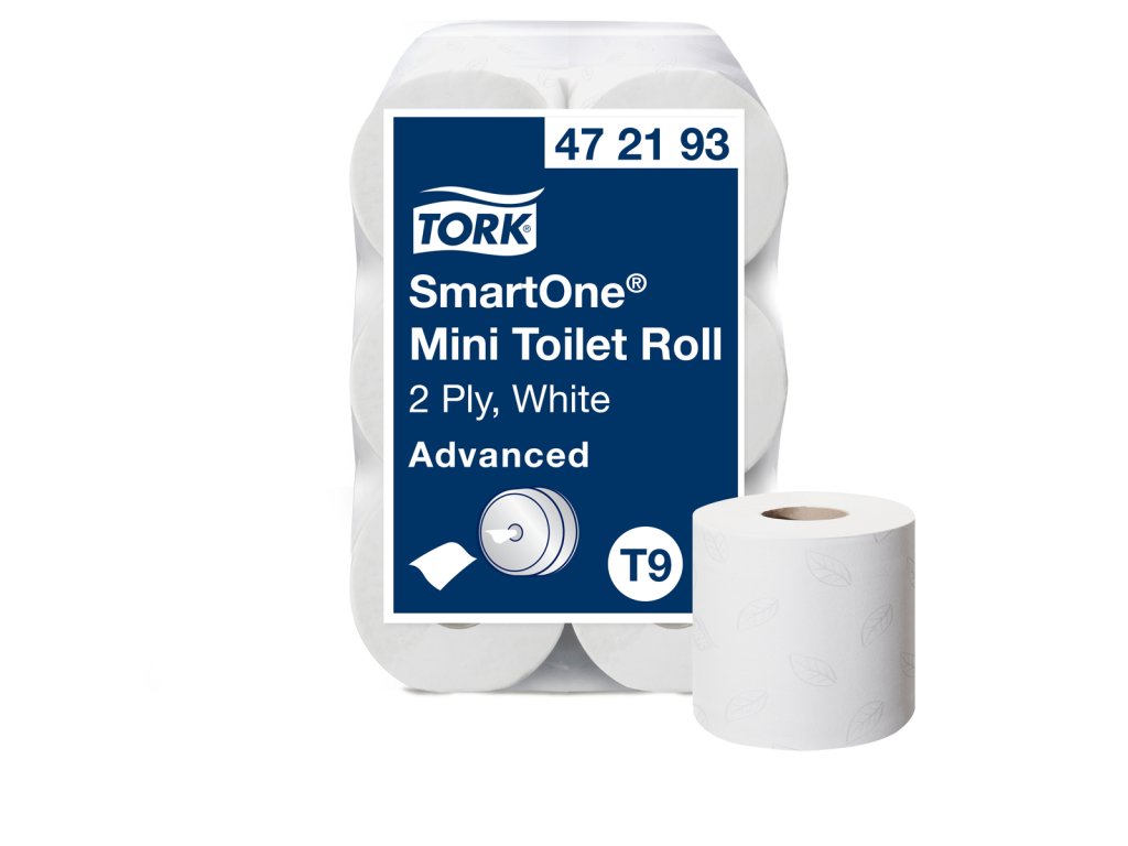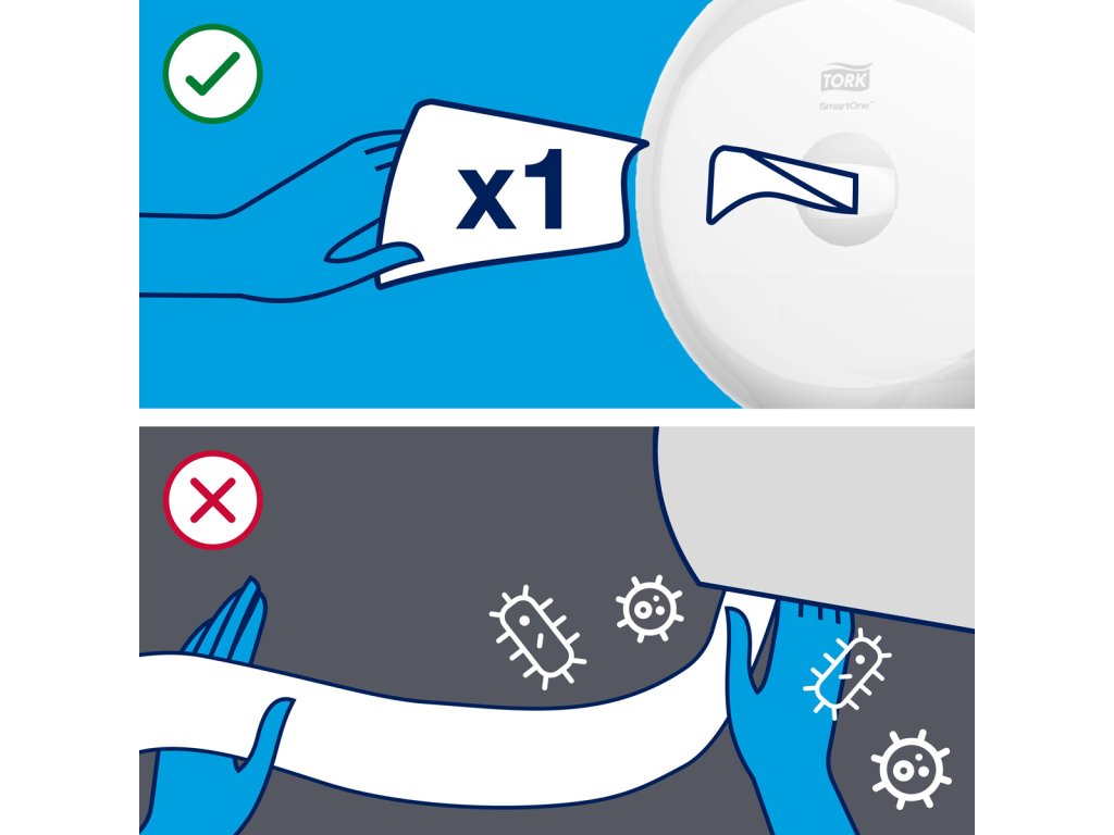 Papier toaletný Tork SmartOne Mini.Zo zásobníka vytiahnete iba 1 útržok a tým šetríte náklady.