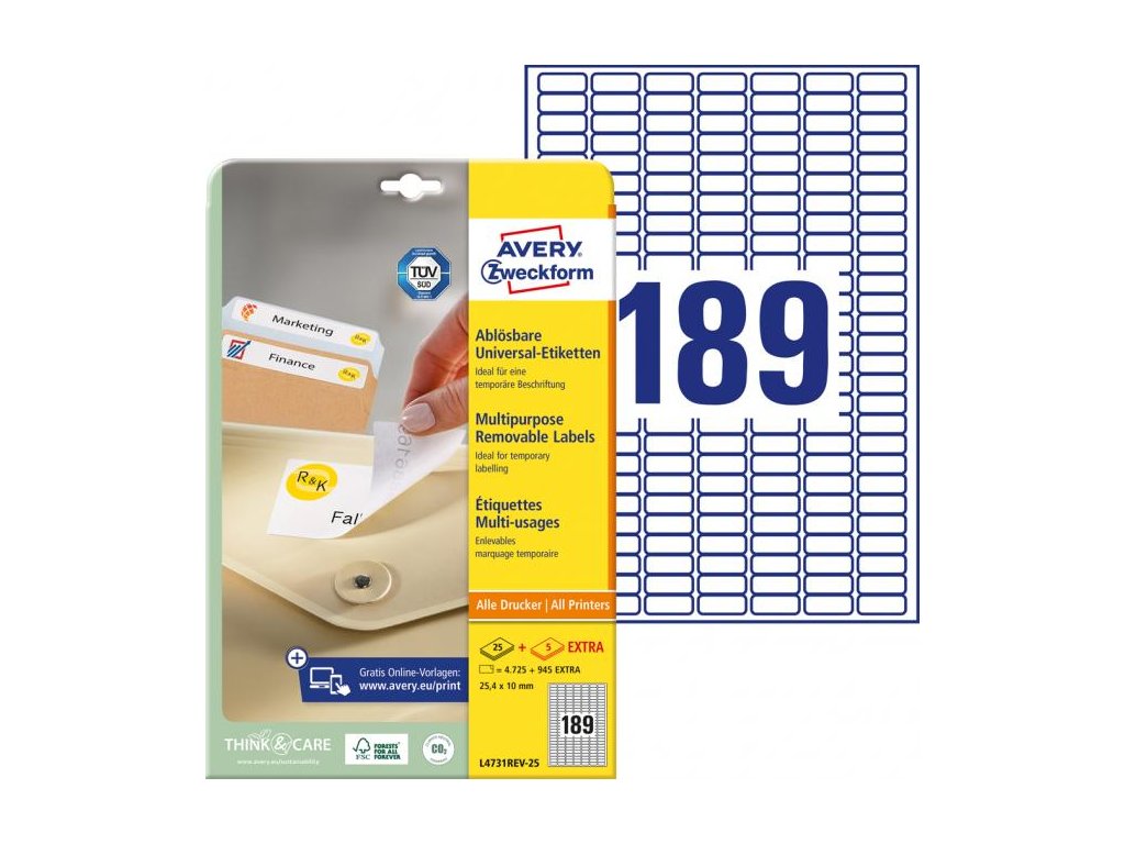 Etikety univerzálne odnímateľné 25,4x10mm Avery A4 25+5 hárkov