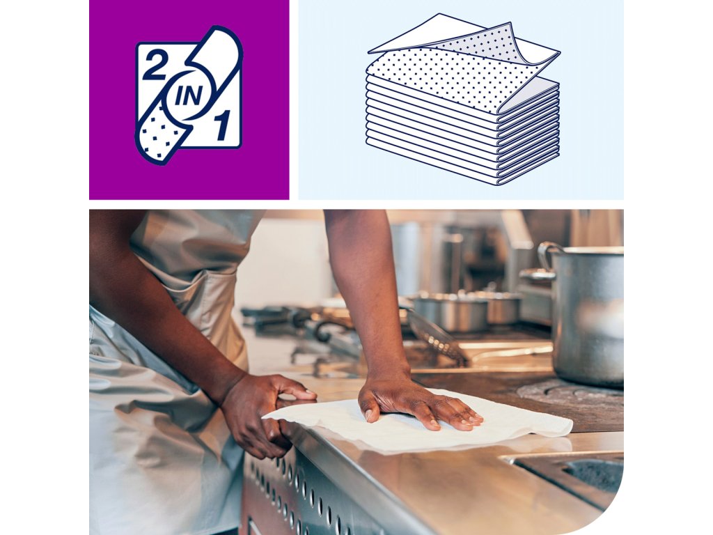 Tork utierky 2 v 1 na drhnutie a čistenie sú abrazívne a absorpčné utierky určené na efektívne upratovanie. Pri čistení odolných nečistôt, napríklad v kuchynskom prostredí, nepoškriabu žiadny povrch. Utierky môžete opláchnuť a znova použiť a sú kompatibilné s bežnými čistiacimi prostriedkami.Utierka profesionálnej kvality, ktorá nezanecháva škrabance