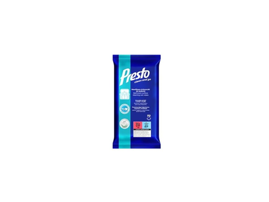 PRESTO VLHČENÉ UTIERKY 72KS-KÚPEĽŇA Rozlúčte sa s vodným kameňom, usadeninami aj fľakmi raz a navždy sú vaším spoľahlivým pomocníkom pre každodennú hygienu a lesk kúpeľne - rýchlo, jednoducho a bez šmúh.Tieto praktické utierky sú navrhnuté pre okamžité použitie - stačí zotrieť a nechať pôsobiť. Bez oplachovania, bez zbytočného čakania. Ich silné zloženie si hravo poradí s nečistotami, vodným kameňom aj mydlovými zvyškami, zatiaľ čo kúpeľni dodajú sviežu vôňu a žiarivý lesk.Dodatočné parametre