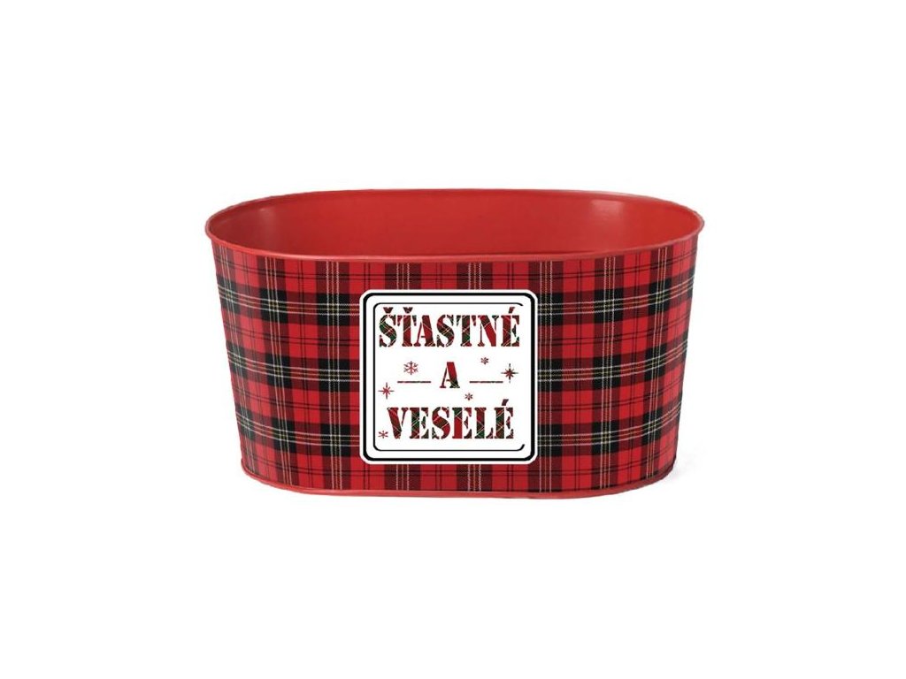 Kvetináč plechový 225x110 mm oválny, `Šťastné a veselé`, červená, čierna, zelená