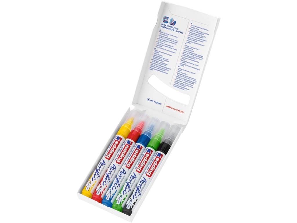 Akrylový popisovač na maľovanie na svetlé alebo tmavé povrchy, ideálny na materiály ako plátno alebo maliarsky papier. Šírka stopy okrúhleho hrotu je 2-3 mm. Vysoko kvalitná pigmentovaná akrylová farba na báze vody je po zaschnutí permanentná, nepriehľadná, svetlostála a bez zápachu. Súprava obsahuje čiernu, dopravnú červenú, enciánovomodrú, dopravnú žltú a žltozelenú farbu. Dodávaný v kvalitnom, znovu použiteľnom puzdre. Vhodné náhradné hroty (edding 5100 náhradné hroty) sú dostupné. Sada 5 kusov. Farba základný mix.