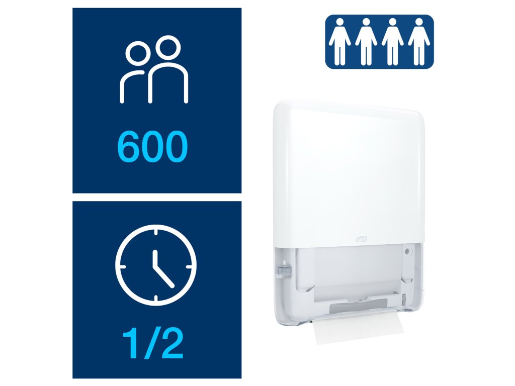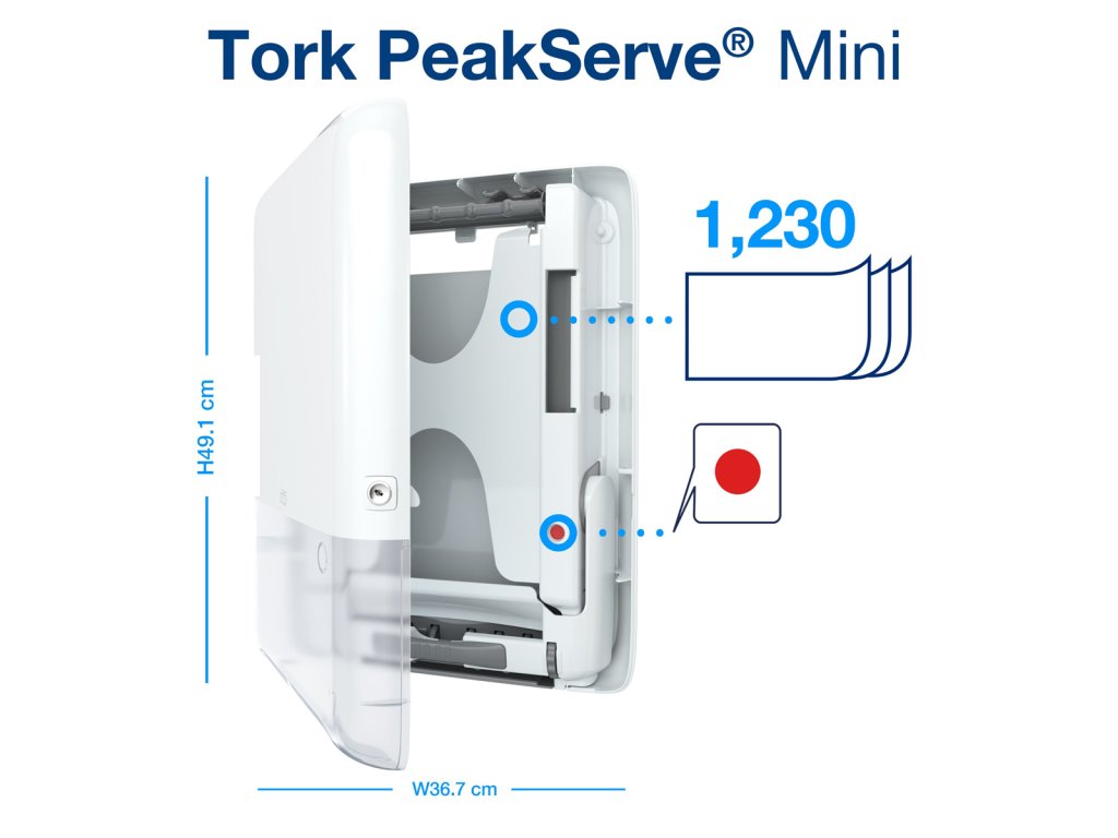 Tork PeakServe® najnovšia inovácia navrhnutá pre vysoko frekventované toalety a umyvárne, kde personál potrebuje maximalizovať čas upratovania a udržať dobrú plynulosť pre návštevníkov. Systém je kompatibilný s Tork PeakServe® nadväzujúcimi utierkami na ruky. Má vysokú kapacitu až 1 230 utierok, ktoré dokáže dávkovať rýchlo a plynulo bez prerušenia. Stlačené náplne sa rýchlo dopĺňajú a môžete ich kedykoľvek doplniť. Ľahko sa uskladňujú a prepravujú, vďaka čomu umožňujú personálu sústrediť sa na upratovanie a nie na dopĺňanie.Výška - 49.1 cm